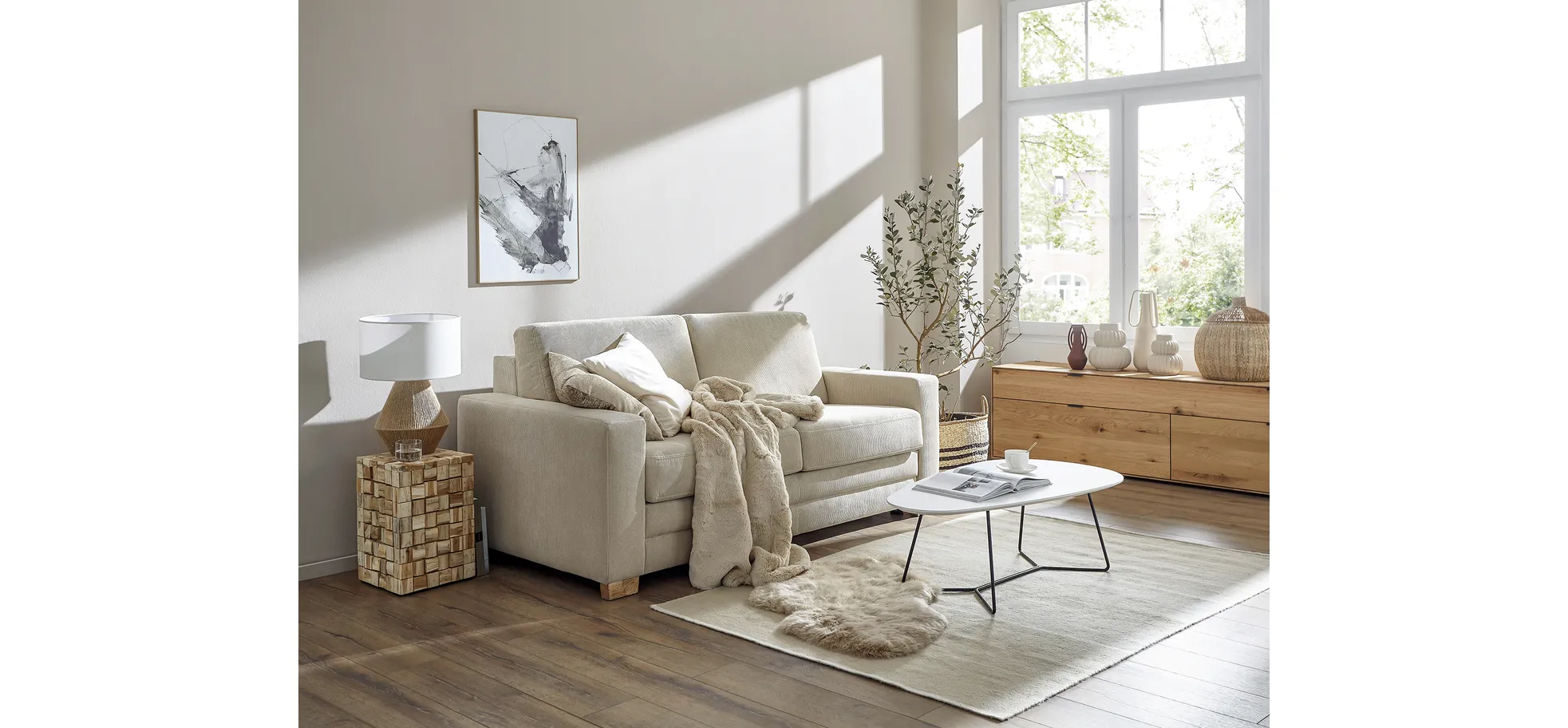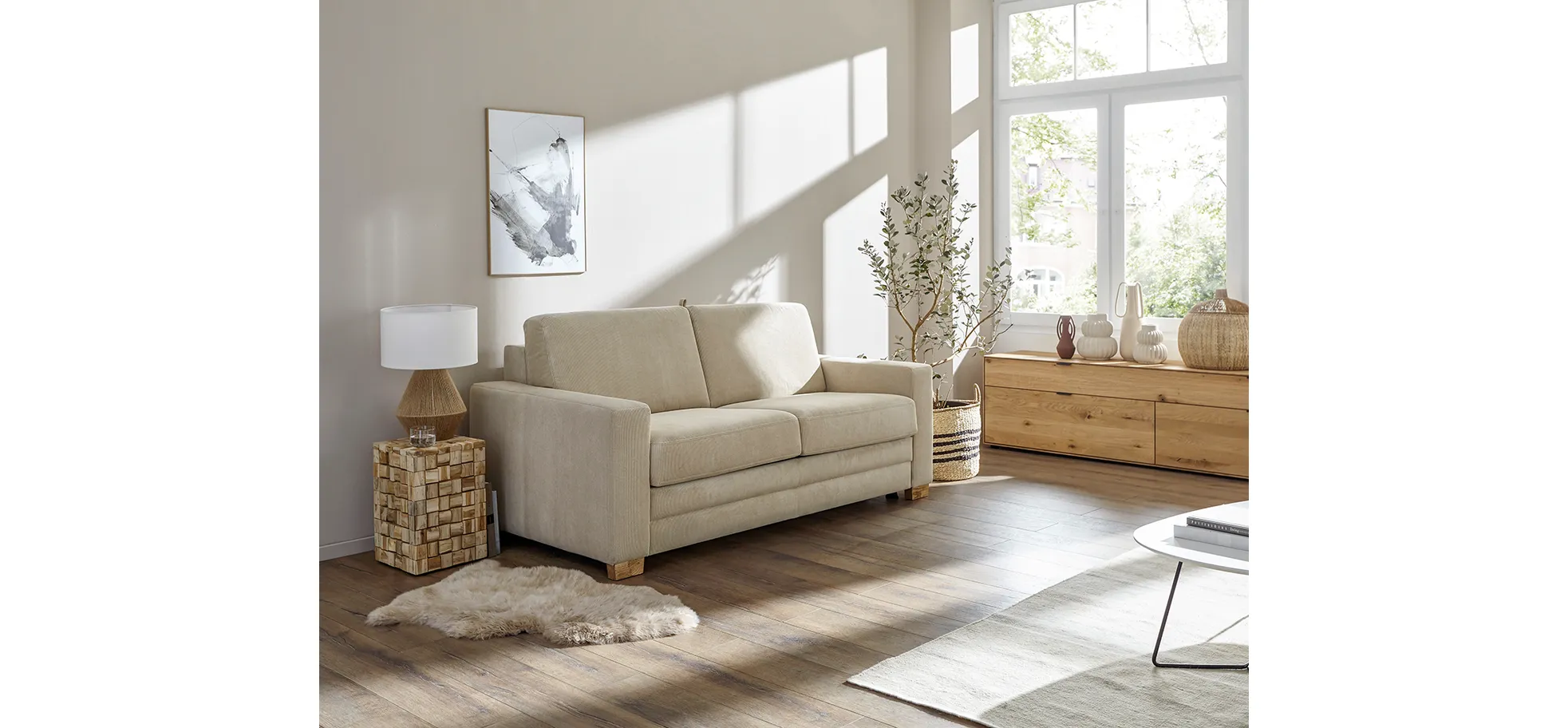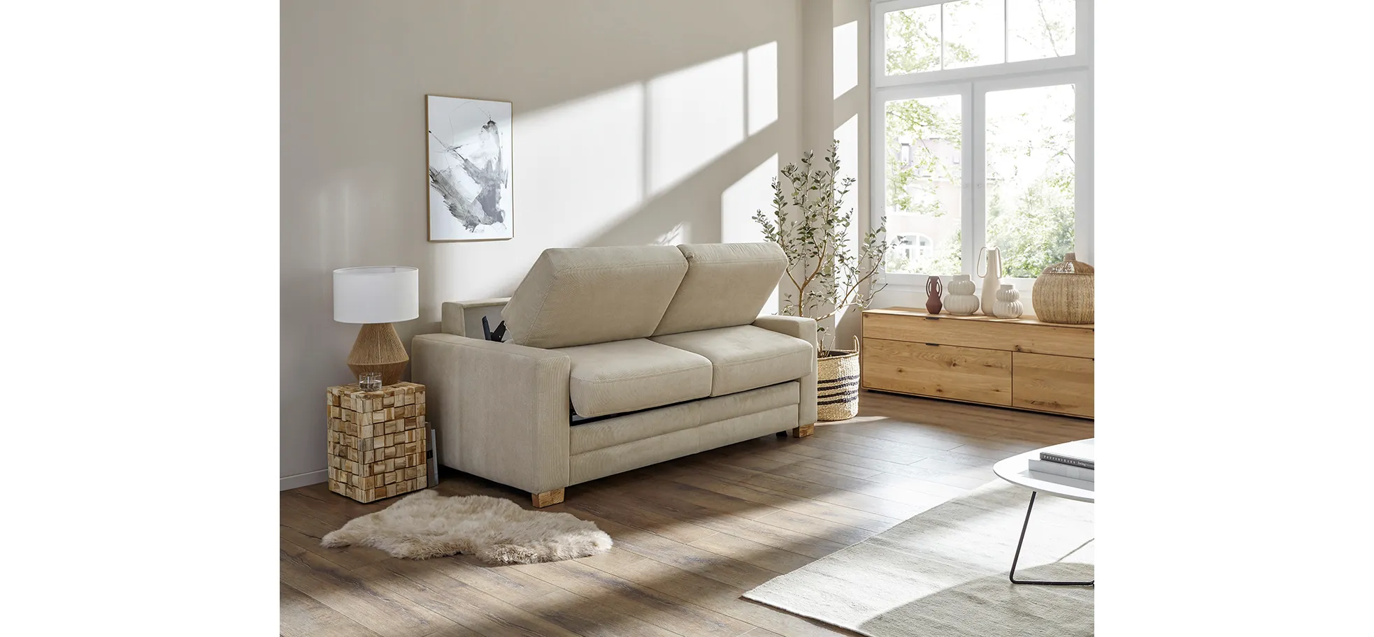 Der Bezug in Kombination mit den Holzfüßen verleiht natürlichen Charme. Mit dem Rundumbezug macht das Sofa aus jedem Blickwinkel eine gute Figur. Durch die überschaubaren Maße hat das Sofa auch in kleineren Wohnzimmern Platz. Heißen Sie Ihr neues Schlafsofa willkommen!