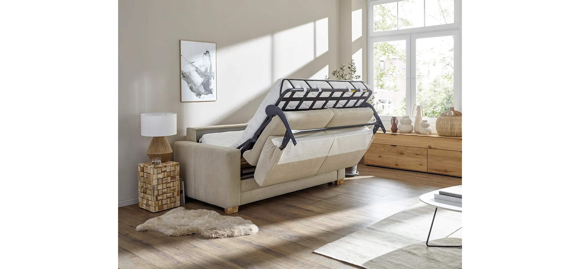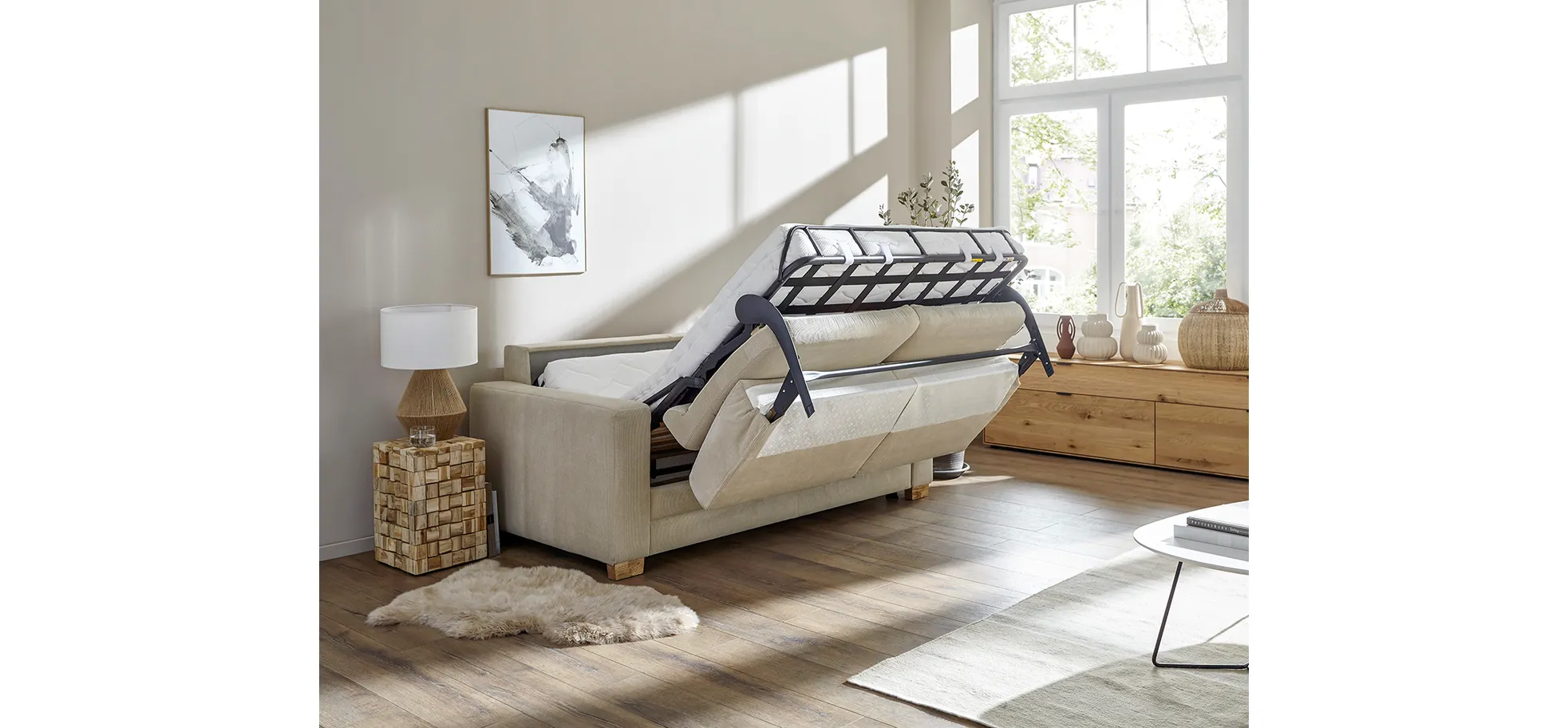 Jeder kennt die Situation: Sie bekommen spontan Besuch, trinken ein paar Gläschen Wein und haben nun einen Übernachtungsgast: Mit diesem Schlafsofa überhaupt kein Problem! Angenehm zum Sitzen ist es allemal. Für den Gast klappen Sie das Sofa dann ganz einfach aus und im Handumdrehen kommt gleich noch eine bequeme Kaltschaummatratze zusammen mit einem Lattenrost hervor. Das Bett ist im Nu gerichtet!