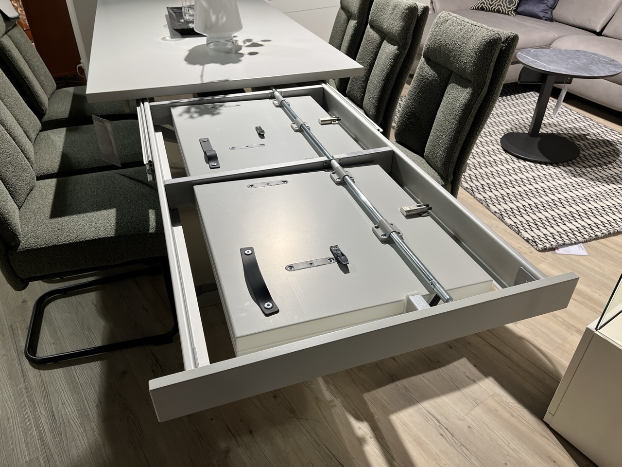 Lack weiß/Lack graphit, Fußplatte in Chrom, Maße ca.: 190(290) x 95 cm, inkl. 2x 50 cm Auszug