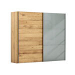Der Schwebetürenschrank Colorado von Natura Home überzeugt durch sein modernes und zugleich natürliches Design. Der Korpus in edlem Cremeweiß wird durch die Abschlussseiten aus Eichenfurnier harmonisch ergänzt und verleiht dem Schrank eine warme Ausstrahlung. Die Front setzt sich aus einer Tür in Eichenfurnier zusammen, während die andere Tür aus Glas in Graugrün gefertigt ist. Der Schrank bietet praktischen Stauraum mit einem Einlegeboden und einer Kleiderstange pro Abteil, sodass Ihre Kleidung ordentlich und übersichtlich aufbewahrt werden kann. Die Schwebetüren sind mit einem hochwertigen Schließdämpfer-Set ausgestattet, das ein sanftes und nahezu geräuschloses Schließen ermöglicht.